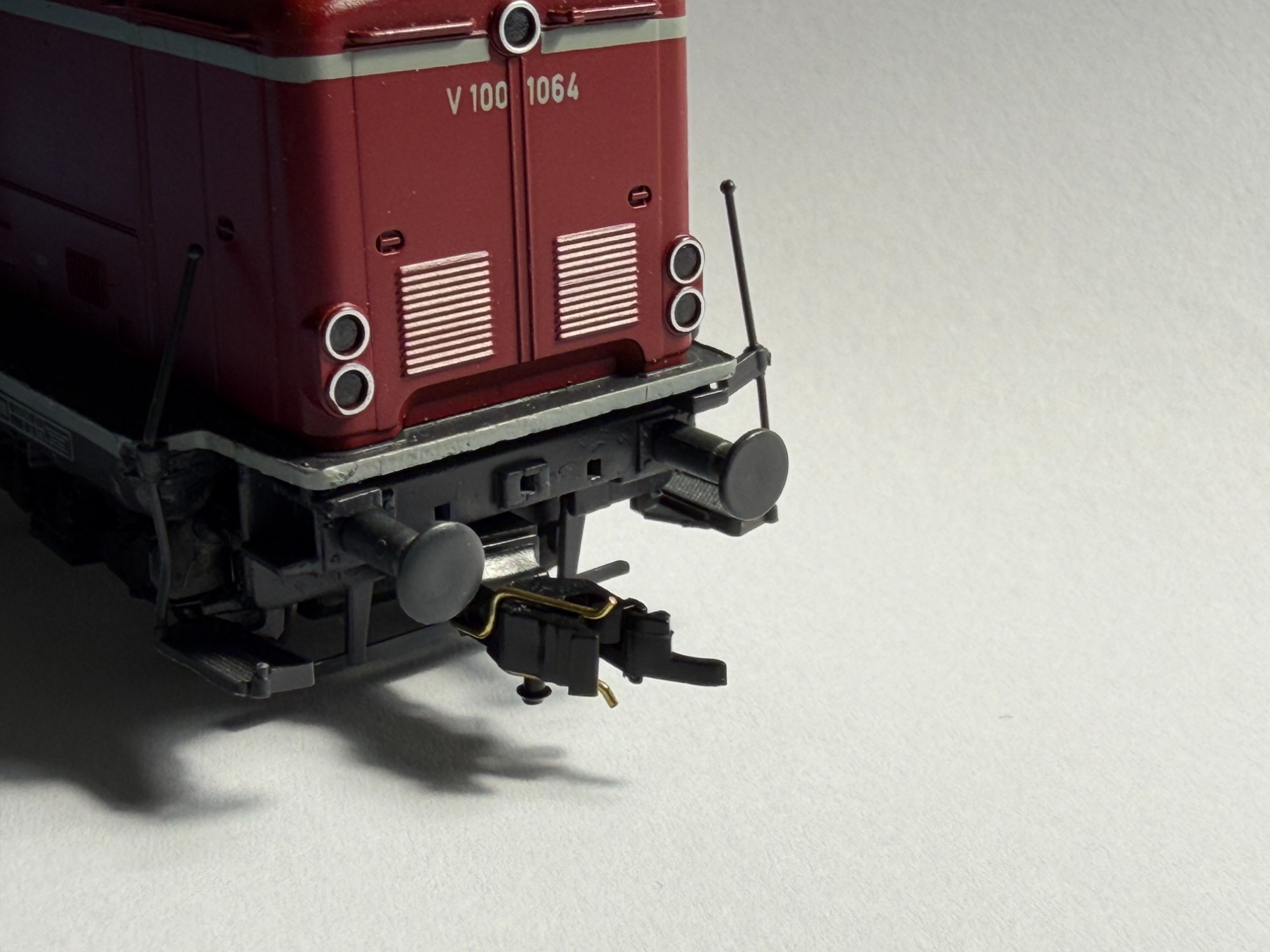 Diese Stromaufnahme führen wir entweder mit einem 2-poligen Kabel mit Microsteckern und Buchsen zum Trennen zur direkt vorausfahrenden Lok, optisch besser sind gleich 2-polige stromführende Kupplungen, z.B. Viessmann Artikelnummer 5048.